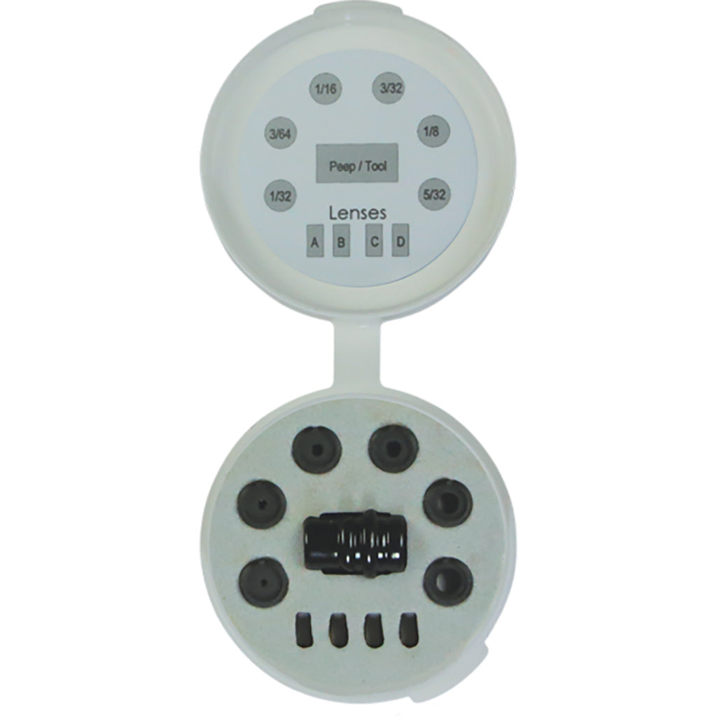 With Light Baffle Technology in the 14 grain housing, you will eliminate all glare due to the aerospace anti-glare technology that produces a field of view with zero distortions. This housing is machined with a 52 degree string angle. This kit includes InSight Short Draw Peep Housing, 6 apertures (1/32", 3/64", 1/16", 3/32", 1/8", 5/32"), aperture installation tool and a protective case.