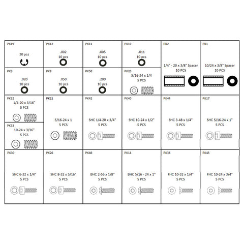 Features:Loaded with a wide variety of screws, bolts, stabilizer studs, e-clips, bolt spacers, cam spacers and much more in a wide assortment of shapes and sizes;310 total pieces;Great for at home or on the tournament trail