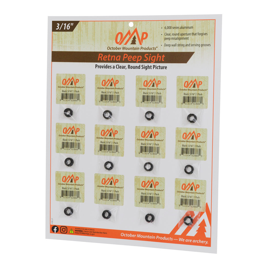 Peep sight features a machined 6000 series aluminum body, deep string grooves, and a serving groove to securely hold the peep in place. The aperture design provides a clear, round sight picture even when slightly misaligned. Available in three standard sizes.