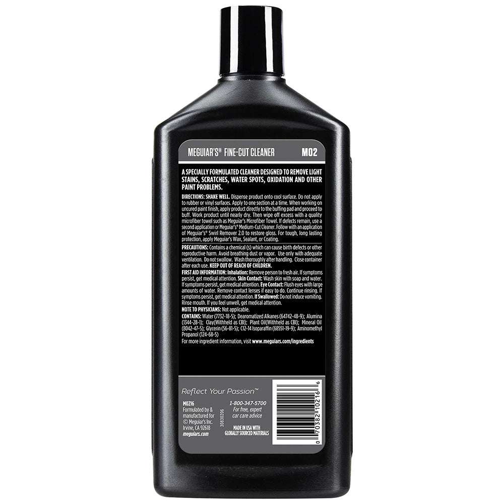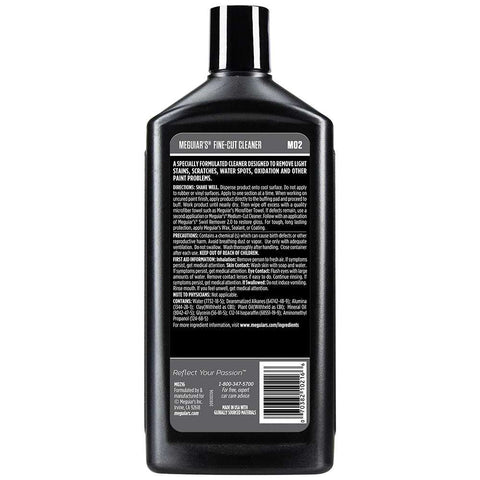 Meguiar's Mirror Glaze #2 Fine-Cut Cleaner is a mildly abrasive cleaner that removes fine surface defects, including light oxidation, stains, scratches, swirls, and fresh water spots. Our special formula of buffered abrasives turns into a gentle buffing rouge, giving you a professional finish that's ready for polishing and protecting. Buffered abrasive action lubricates the finish to prevent scouring. This professional cleaner also leaves a silicone-free surface essential for proper painting in a body shop environment. Safe and effective on all glossy paint finishes, including clear coats, and ideal for older lacquer and enamel paints.