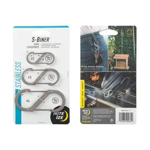 Made of high quality, weather-resistant stainless steel, this ultra-handy accessory with its dual spring gates will hold, secure, and connect everything from keys to water bottles to gear. Smaller-sized S-Biners are excellent for connecting two zipper sliders on backpacks, duffels, and suitcases. We know that one size doesn't fit all, so we've designed six different sizes so you can choose the right size for the task at hand. We've found that the smaller sizes work great for hanging smaller items from a purse or backpack strap, attaching to individual keys, or hanging a plant from a ceiling hook. The larger sizes work great for bigger jobs like hanging a paint can from a ladder or a tool to your tool belt. The #2 holds up to 10 lbs., #3 holds up to 25 lbs., and #4 holds up to 75 lbs.