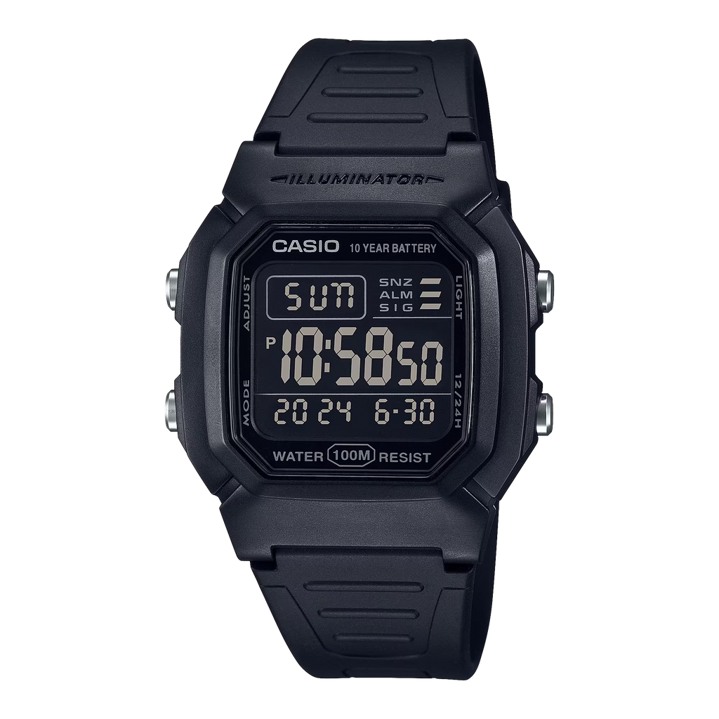 This classic sport watch features 5 alarms, water-resistance to 100 meters, stopwatch, countdown timer, LED backlight, dual time, and a 10-year battery life.