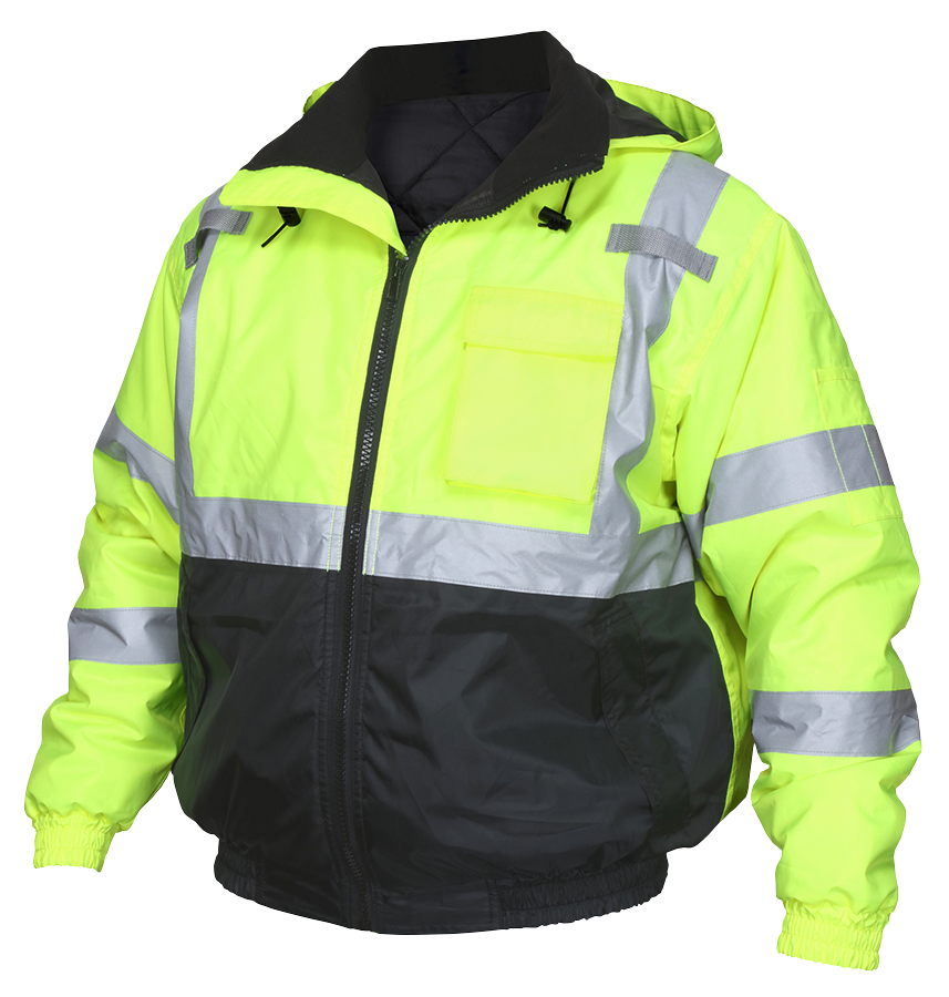 For those applications where being seen is of the utmost importance, MCR Safety's Luminator Series offers you a variety of high visibility garments to fit your specific applications. The VBBQCL3L is an ANSI/ISEA Type R, Class 3 Bomber style jacket that features a bright fluorescent lime background color for daytime high visibility and 2” silver reflective stripes for low light visibility. The black shading on the lower front of the torso is dirt masking and extends wear life. The inner quilted liner adds warmth and comfort that you will enjoy wearing. Other features include a hideaway drawstring hood with pull stops, zipper front closure, two front pockets, left chest cell phone pocket, and left and right side mic-tab holders. Three inner pockets offer additional storage for belongings.