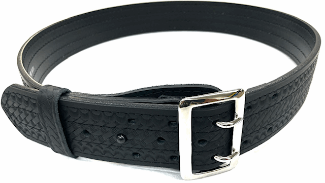 2.25 inch 4 row stitching, 13oz Sam Browne leather belt in black with chrome buckle. Basketweave finish.