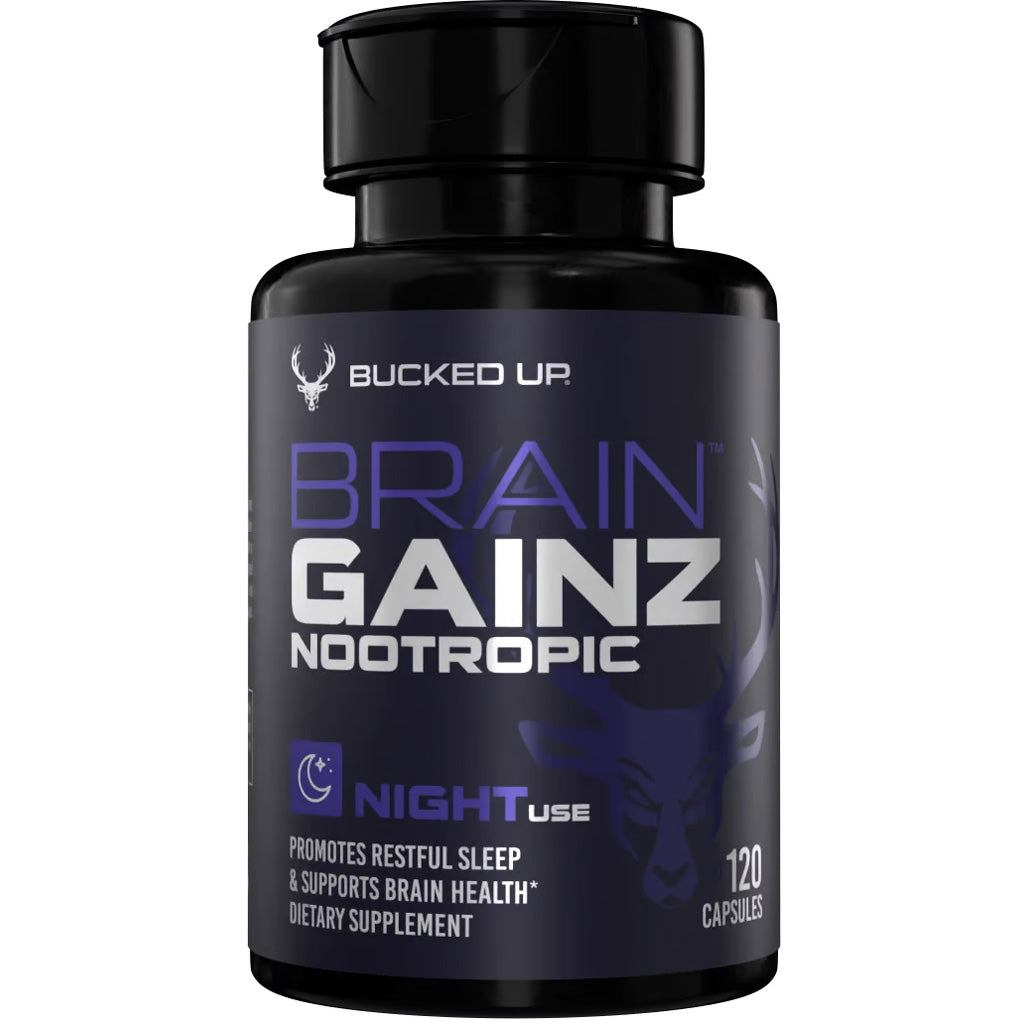 Bucked Up Brain Gainz Day & Night Supplements deliver a 24-hour nootropic solution to help you stay sharp during the day and unwind at night. This 240-capsule system includes AM and PM blends crafted with key ingredients like natural caffeine, B-vitamins, taurine, L-tyrosine, and synergistic mushroom blends to enhance focus, energy, and mood throughout your day. When it?s time to relax, the PM formula features L-theanine, lemon balm, and stimulant-free adaptogens to promote restful sleep and mental recovery. With critical nutrients for cognitive and physical performance, Brain Gainz helps you recharge and repeat every day with clarity and purpose.