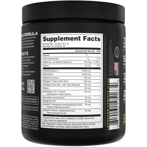 Features:100 percent all-natural and certified organic formula;Contains 333mg of caffeine per serving;Includes 6,000mg of Citrulline Malate;Formulated with 50mg of Deer Antler Velvet;Features major nootropics for focus and endurance;Enhances blood flow during workouts;Promotes muscle growth and improved athletic performance;Accelerates post-workout muscle recovery;Fully transparent and generously dosed ingredients label;Offered in a variety of unique and delicious flavors;Designed for advanced users seeking high-stimulant energy and mental clarity;Packaged in a convenient 30-serving tub