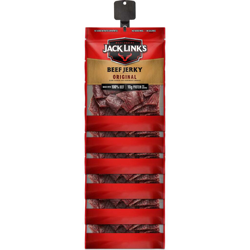The Jack Link?s 3.25 oz Beef Jerky Clip Strip combines Original and Teriyaki flavors in one compact, high-impact display. Featuring six bags of each flavor, this 12-count clip strip provides the perfect mix of classic and sweet-savory snacking options. Each resealable bag is made with 100 percent premium beef, offering a protein-packed treat for busy, on-the-go customers. The vertical clip strip format is easy to hang on shelves, endcaps, or checkout areas, maximizing visibility and driving impulse sales without taking up much space.