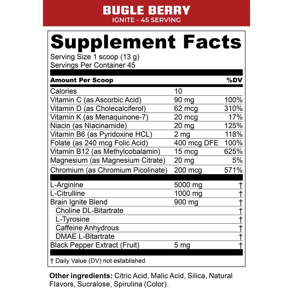 Features:Flavor: Bugle Berry;21 oz tub with 45 servings;200 mg caffeine per scoop;Includes L-Arginine and L-Citrulline;Contains nootropics for cognitive support;Zero sugar;Gluten-free;Promotes energy and mental focus;Supports nitric oxide production;Enhances physical performance