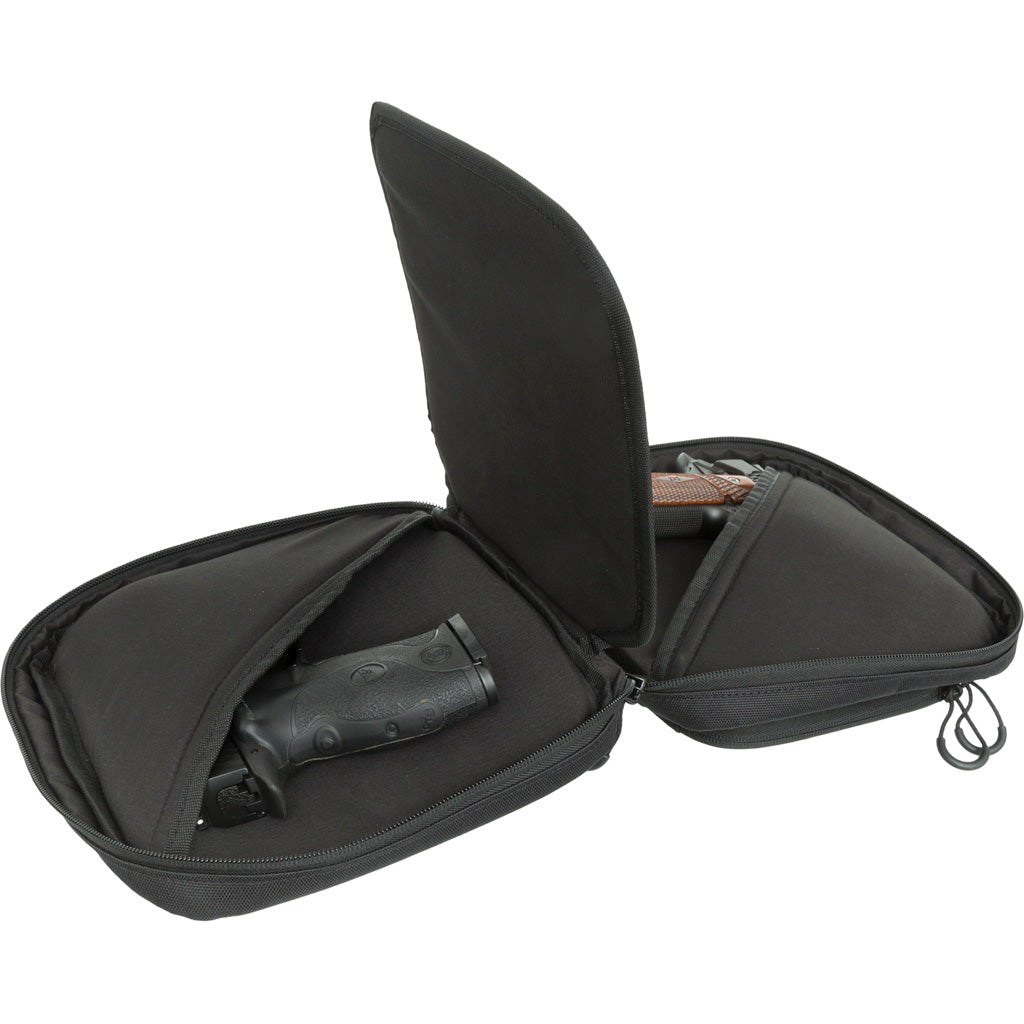 Features:Center Divider For Protecting 2 Pistols;Zippered Accessory Pocket with 4 Magazine Sleeves;Rugged 900D Shell with Dual-density Padding and 150D Brushed Lining;Main Compartment Dimensions: 9.5"x8.5"x2.25";Holds two pistols;Main compartment dimensions: 9.5 x 8.5 x 2.25 inches;Rugged 900D shell construction;Dual-density padding for added protection;Soft 150D brushed lining;Center divider protects and separates handguns;Compact and travel-ready design
