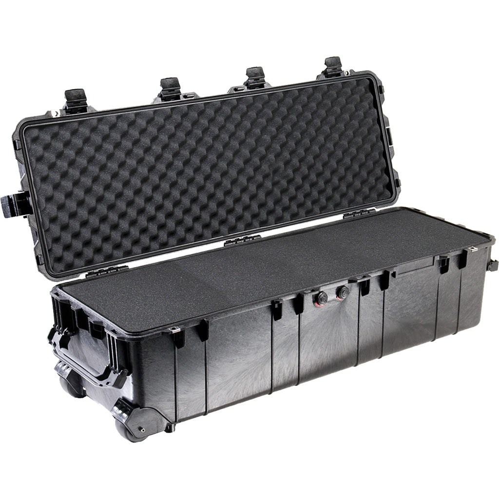 The 1740 Protector Case has four extra-deep, base-to-lid locking cleats for stacking stability with automatic pressure equalizing and an O-ring seal creating watertight, crushproof and dustproof protection for your firearm. Other features include a 6-piece pick-n-pluck foam set, Wide-track polyurethane wheels with ball bearings and nylon hubs, fold-down side handle, double-throw latches, stainless steel hardware and padlock protectors with a 41"x12.9"x12.1" interior.