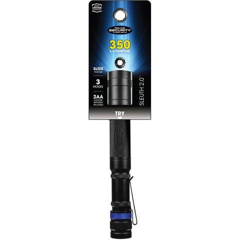 The Police Security Sleuth 2.0 Flashlight is a reliable, ultra-bright everyday flashlight designed for versatility and durability. Delivering 350 lumens of illumination with a 140-meter beam distance, it is perfect for emergency situations, household use, and outdoor adventures. The slide focus function allows for seamless adjustment between spot and flood beams, while three lighting modes (High, Low, and Flash) provide flexibility for different lighting needs. Built with a rubberized grip for secure handling, this impact-resistant, water-resistant flashlight is powered by 2 AA batteries (included) for long-lasting performance.