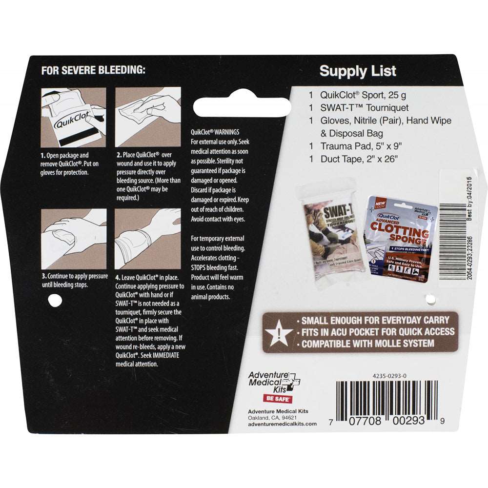 You simply apply QuikClot over bleeding areas to speed clotting.  Swat-T Tourniquet is engineered for use in the field and allows a rapid means to control extremity bleeding, quickly and easily with its Swat-T (Stretch, Wrap and Tuck Tourniquet) technology.  Individuals can quickly apply it in seconds with little or no prior medical training.
