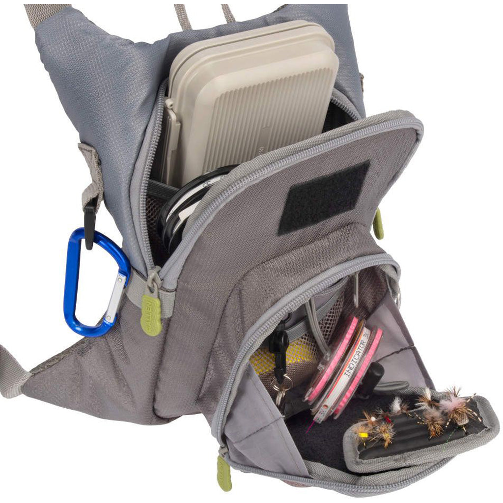 Features:Zip-down front pocket workstation with tippet spool holder;Fly patch placement inside workstation or on front hook-and-loop panel;Main compartment holds up to two fly/tackle boxes;Dimensions: 8 x 3.25 x 9.75 inches;Two internal mesh accessory pockets;External mesh pocket for small tackle or leaders;Web tab for attaching retractors or tools;Lower D-ring for attaching tippet holders or tools;Padded, adjustable neck strap with D-ring for fishing net;Adjustable waist strap for secure fit;Lightweight and compact design for all-day comfort