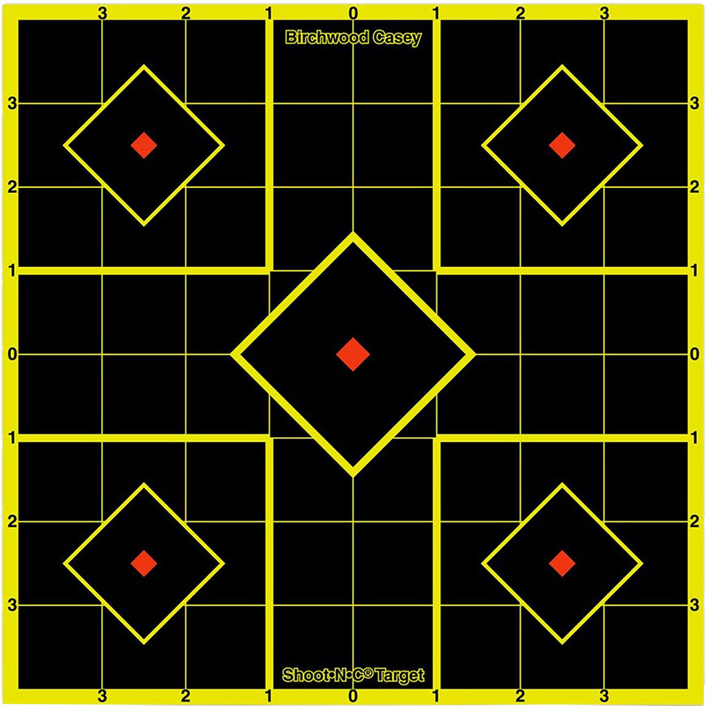 The Birchwood Casey Shoot-N-C Target features five targets on each sheet. The center target is for sighting-in and four smaller targets are for testing results of various ballistic loads or for confirmation of sight-in groups. There are convenient 1 inch numbered grid lines to simplify scope adjustments.