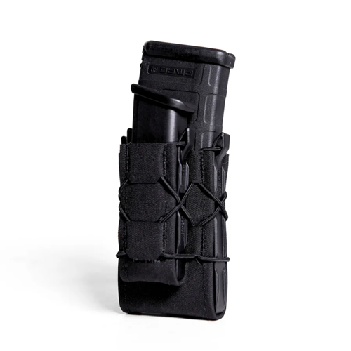 The Generation 2 Double Decker TACO is sleeker, lighter, and more versatile than the original. Like the Original Double Decker TACO, the Gen 2 Double Decker TACO holds 1 rifle magazine and 1 pistol magazine, or similarly sized items. Contoured molded sides allow easy insertion of magazines. Integrated shock cord provides adjustable retention. Constructed from laser-cut nylon laminate wrapped over a woven thermaoplastic core, Gen 2 TACOs weigh almost 20% less than the Originals. 1/2 inch interval MOLLE on the back of the TACO allows for both MOLLE and belt mounting options. With the addition of an HSG OTR Cover accessory, any Gen 2 TACO can be set up covered or open-top.