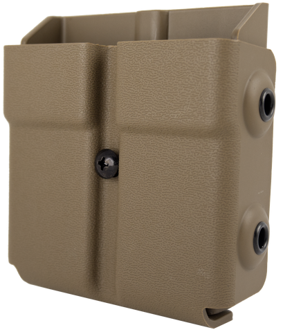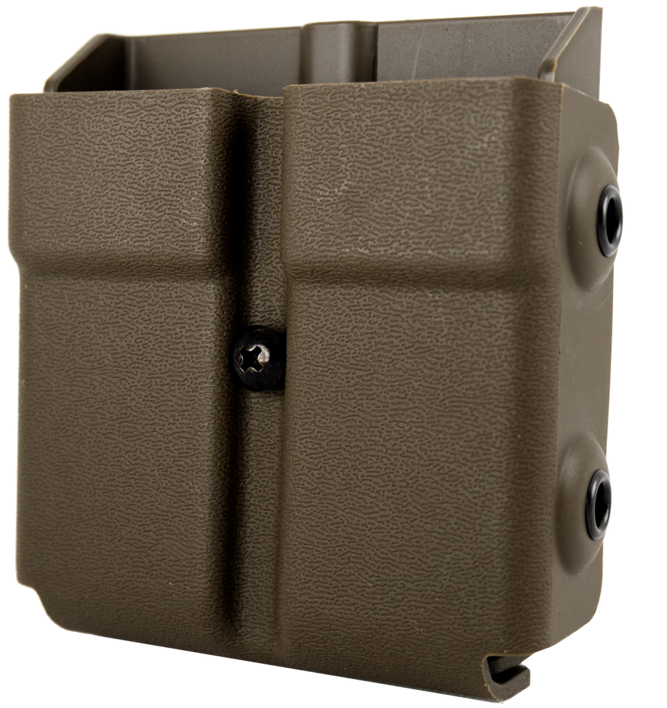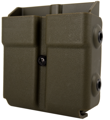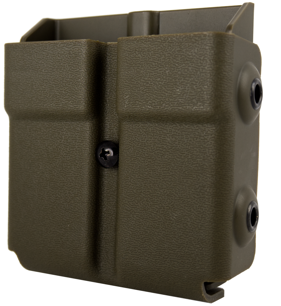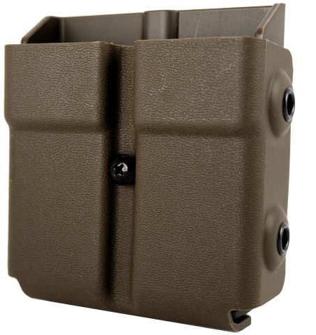 Slimline ruggedized double pistol mag case for double stack Glock 9mm and .40 caliber mags with bullets facing your centerline for a traditional orientation method of carry. Fits Glock doublestack 9mm or .40 caliber magazines. Compatible pistol models include: G26, G27, G19, G23, G17, G22, G45, G34. Does not fit non-Glock mags.