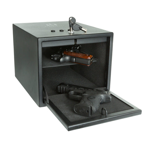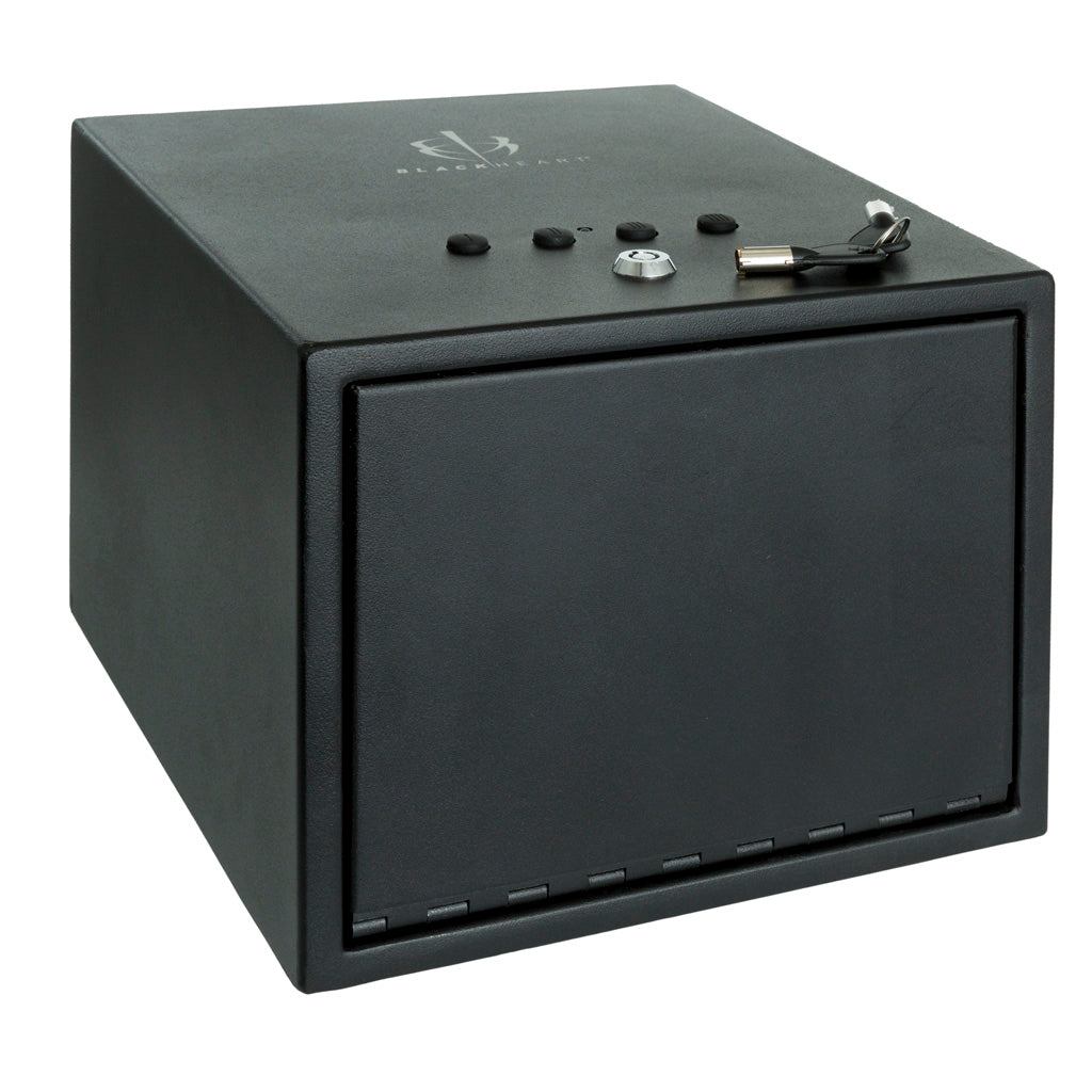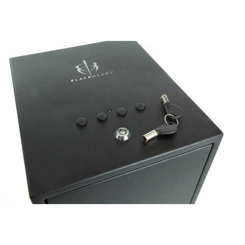 The BlackHeart Double Gun Pistol Vault features solid carbon steel construction with a foam lined interior. Compact size easily stores two handguns or other valuables. Opens with a key or user-configurable 4 button combination. Internal dimensions are 11.25" x 8.75" x 7.25".