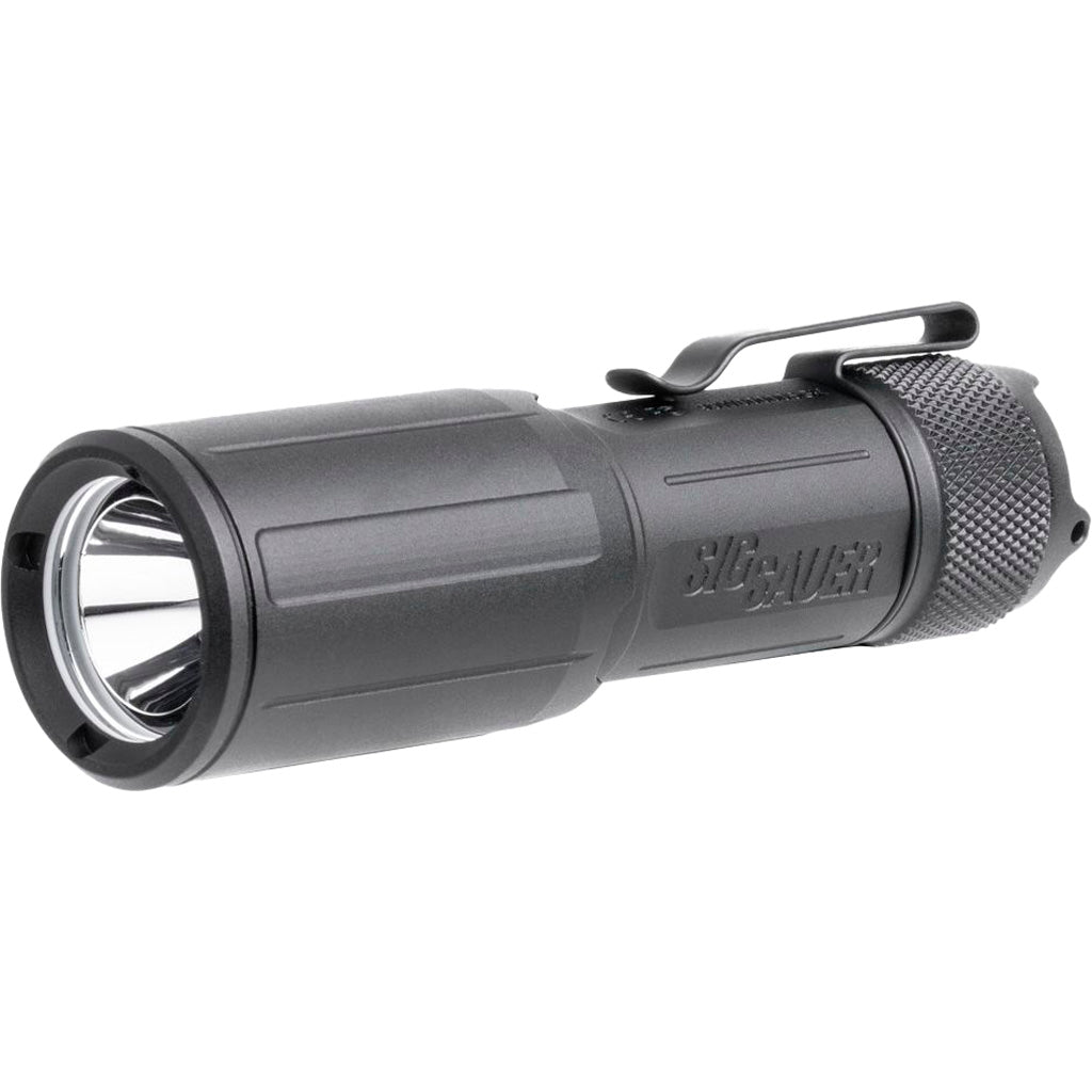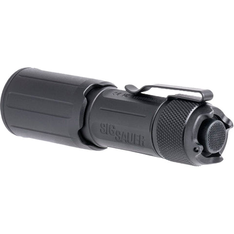 The Sig Sauer FoxTrot-EDC Compact Light is both lightweight and sturdy. It produces a brilliant 1350 lumens output with a 33,000 Candela peak beam intensity for clear illumination in any situation. The light offers a push-button activation with momentary and latching modes for versatile use. It runs up to 60 minutes on a single charge and is powered by a rechargeable 18350 lithium-ion battery. It includes a metal deep carry pocket clip, is compact at 4.12 inches in length, and comes with two tailcaps, including a crowned version for self-defense.