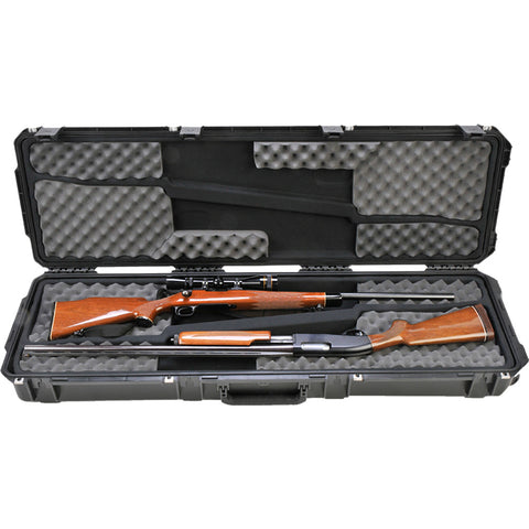 Double Rifle Case interior cavity features a fabric lining with molded EPS lid and base liners for structural strength and rifle separation holding rifels up to 48" in length. Other features include rigid foam dividers, waterproof and dust tight design, snap-down over-molded cushion grip handle, TSA key locking latches, molded-in hinge, in-line style wheels, ambient pressure equalization valve, Unconditional Lifetime Warranty, and $1500 Content Coverage. 49"x13.5"x3.5", 25 lbs.